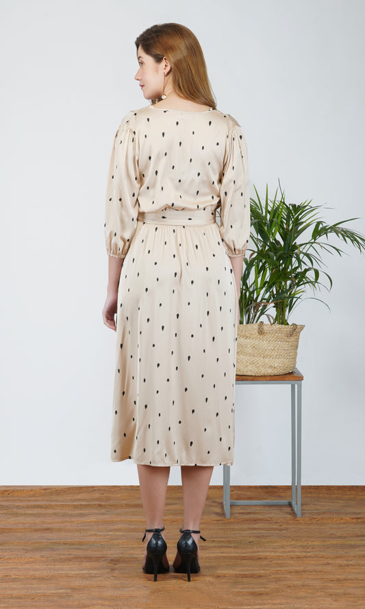 The wrap-style bodice creates a flattering V-neckline, while the matching waist tie lets you adjust the fit to perfection. Featuring a soft beige base adorned with chic black teardrop prints, this dress adds a modern twist to a classic midi look. The 3/4 sleeves with gathered cuffs enhance the overall polished appeal, making it ideal for day-to-night styling.